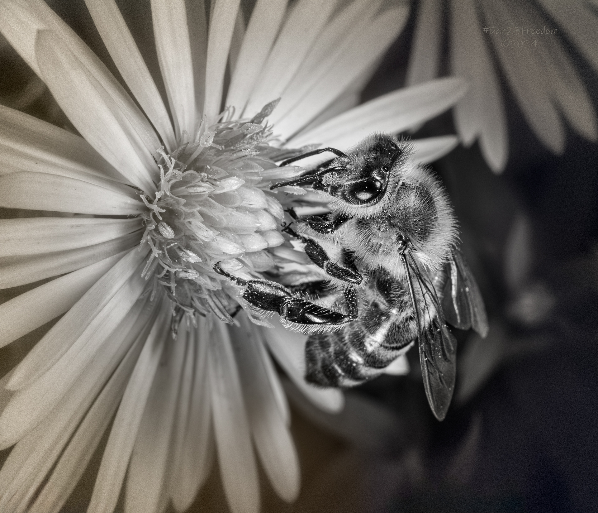 A detailed close-up of a bee on a flower, blending modern sharpness with retro film elements for a timeless feel.