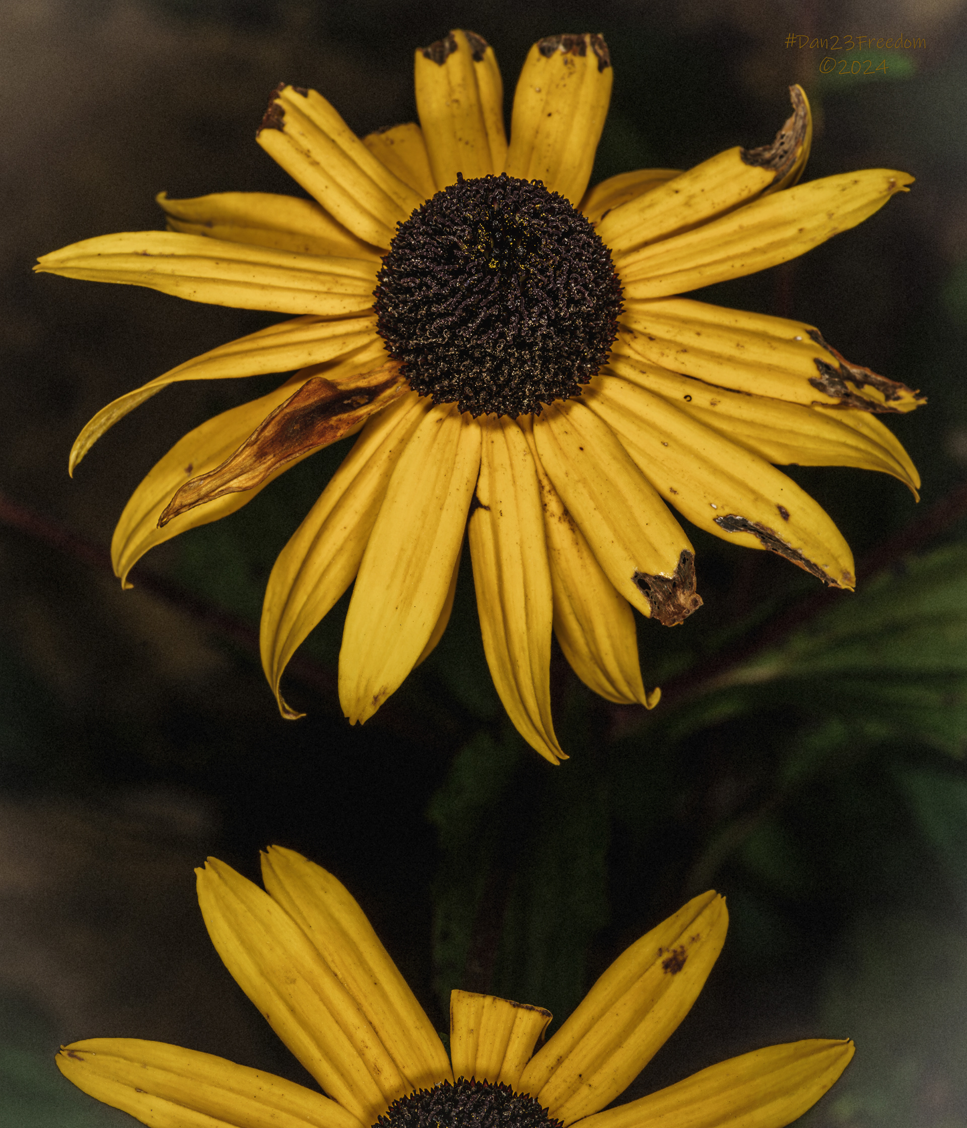 A sunflower’s wilting petals and muted colors poignantly illustrate the beauty in life’s inevitable fade.