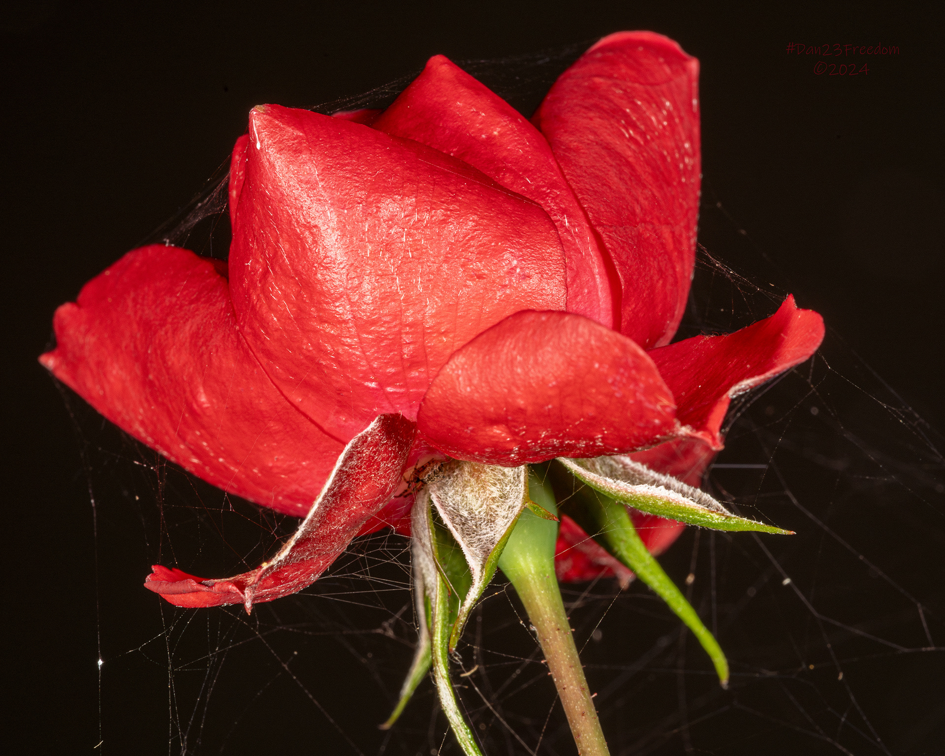 A single red rose adorned with spiderwebs stands out in sharp relief against a dark backdrop.