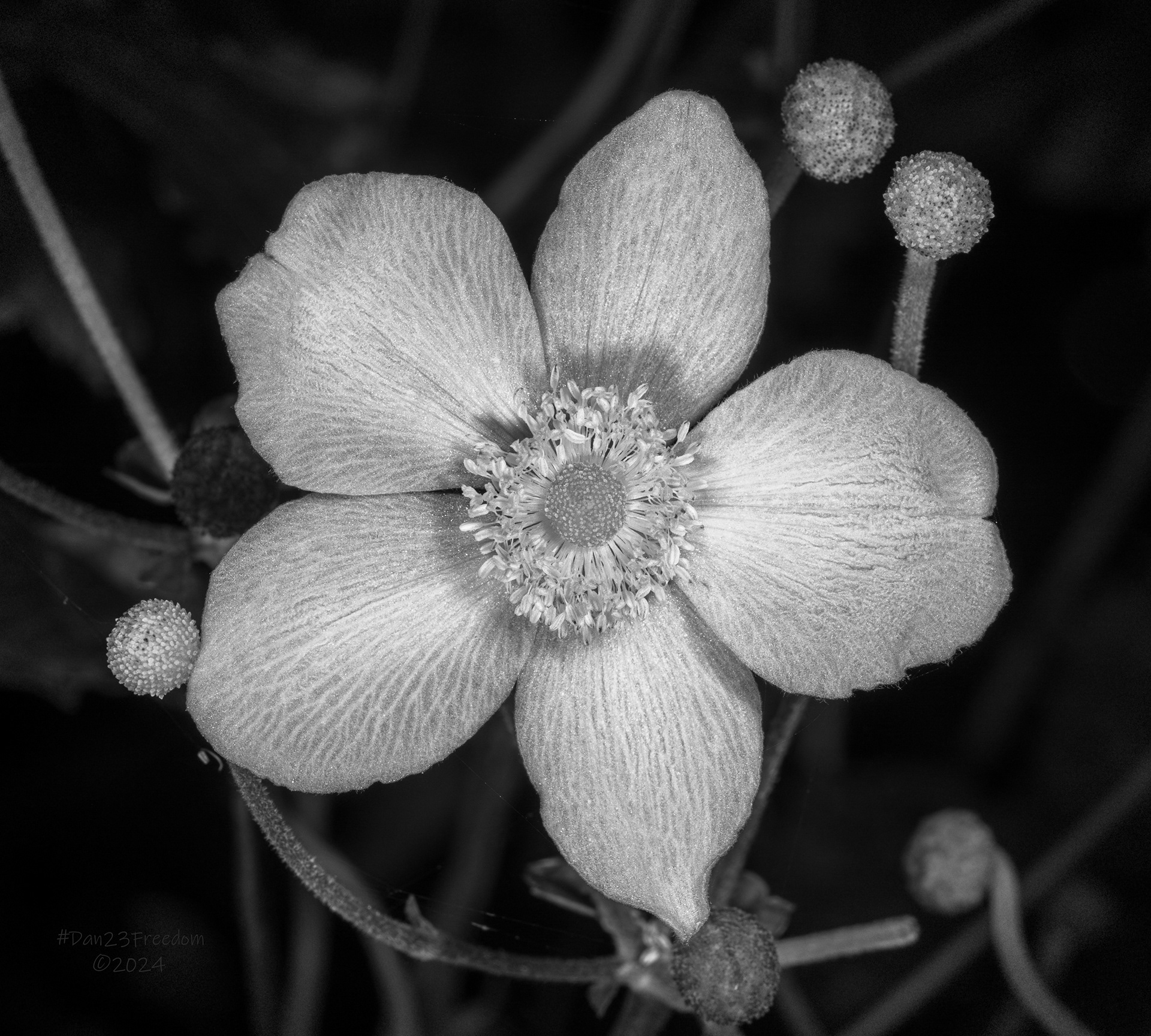 A serene monochrome portrait of a five-petaled flower, emphasizing its delicate textures against a soft backdrop.