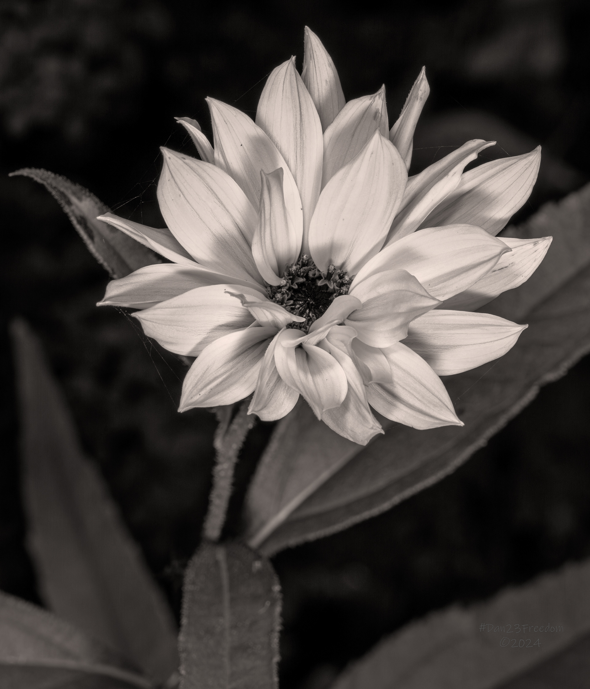 A detailed black and white photograph showcases the delicate textures and stark contrasts of a flower in full bloom.